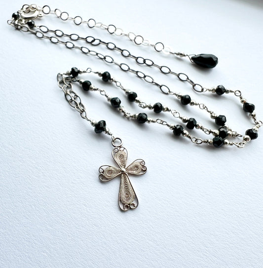 Sterling silver filigree cross necklace paraguayan cross black spinel necklace