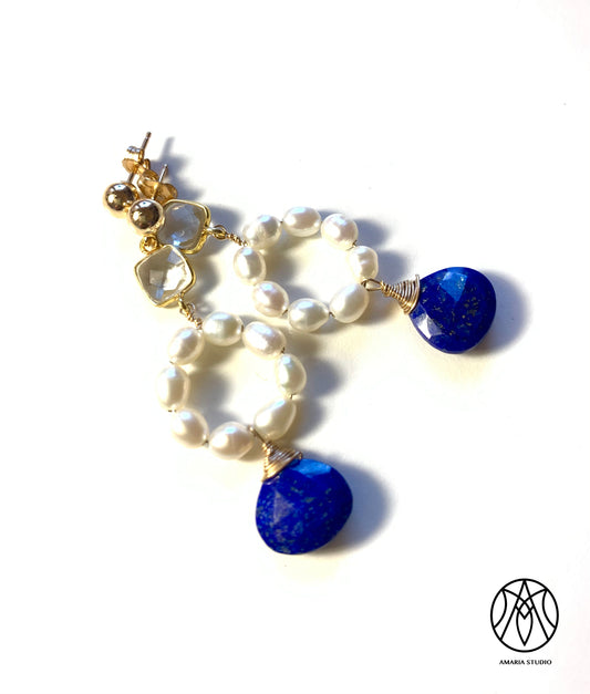 Quartz, pearl, lapis lazuli earrings